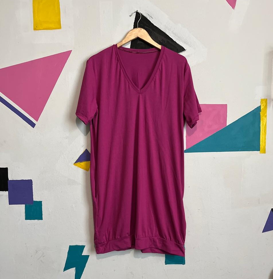 Vestido básico, confortável, com bolso nas laterais na cor magenta.